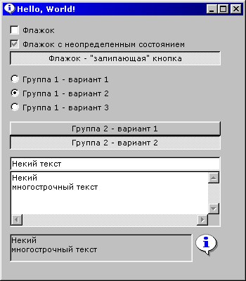 . . . . . const ID_CHECKBOX_1 = $101; ID_CHECKBOX_2 = $102; . . . . . ctl := CreateWindowEx ( 0, 'BUTTON', 'Флажок', WS_CHILD or WS_VISIBLE or BS_AUTOCHECKBOX, 10, 10, 150, 20, Wnd, ID_CHECKBOX_1, HInstance, nil ); . . . . . ctl := CreateWindowEx ( 0, 'BUTTON', 'Флажок с неопределенным состоянием', WS_CHILD or WS_VISIBLE or BS_AUTO3STATE, 10, 30, 300, 20, Wnd, ID_CHECKBOX_2, HInstance, nil ); . . . . .
