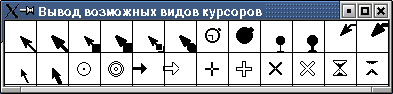 В первом методе используется специальный шрифт "cursor" и функция XCreateFontCursor(). Эта функция принимает идентификатор формы, и возвращает дескриптор на созданный курсор. Список возможных шрифтовых идентификаторов находится в файле /usr/include/X11/cursorfont.h. Всего их более 70; вот некоторые из таких курсоров: