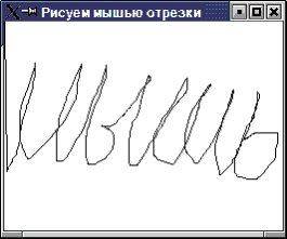 - время (в миллисекундах), которое длилось событие.Как пример, следующий код определяет режим рисования для графического редактора, в котором, если пользователь перемещает мышь, удерживая первую ее кнопку, мы рисуем на экране. Этот код имеет недостаток: поскольку перемещение мыши может генерировать много событий, вполне возможно, что мы не получим событие движения мыши для каждого пикселя, над которым проходит мышь. Один из способов разрещения этой ситуации состоит в запоминании последнего пикселя, над которым была "протащена" мышь, и рисованием линии между запомненной и новой позициями указателя мыши.