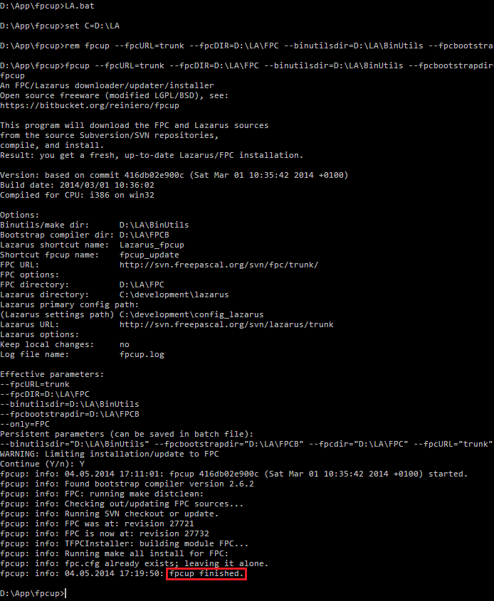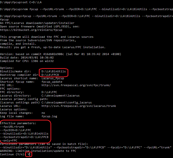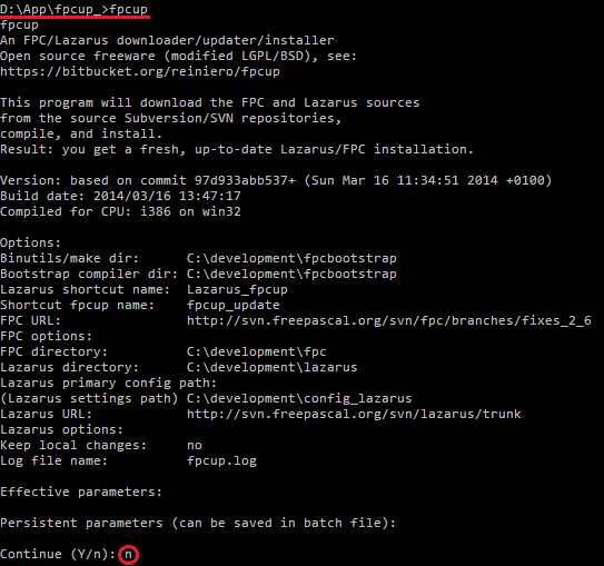 Перед тем, как набрать Y, проверьте, что установлены правильные параметры. --fpcURL должно быть trunk. Начнётся работа fpcup. Нужно сказать, что работать он будет долго, поэтому если некоторое время новый текст в консоли не выводится, не следует принудительно завершать работу. Скорее всего, скрипт работает, следует просто подождать.
