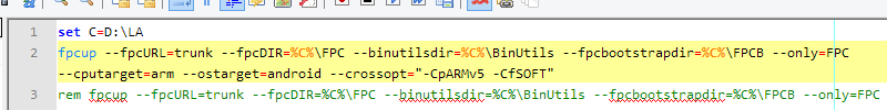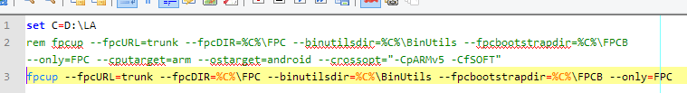 set C=D:\LA rem fpcup --fpcURL=trunk --fpcDIR=%C%\FPC --binutilsdir=%C%\BinUtils --fpcbootstrapdir=%C%\FPCB --only=FPC --cputarget=arm --ostarget=android --crossopt="-CpARMv5 -CfSOFT" fpcup --fpcURL=trunk --fpcDIR=%C%\FPC --binutilsdir=%C%\BinUtils --fpcbootstrapdir=%C%\FPCB --only=FPC