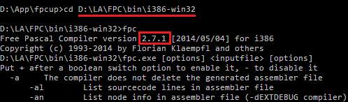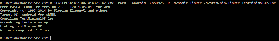 Вместо D:\LA вписывать путь в который установили Free Pascal trunk для ARM Android. В результате запуска такой команды вы должны увидеть что-то вроде этого: