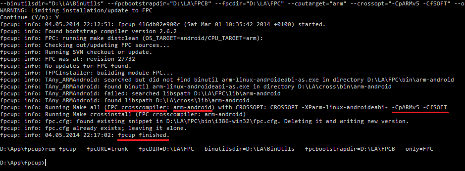 set C=D:\LA fpcup --fpcURL=trunk --fpcDIR=%C%\FPC --binutilsdir=%C%\BinUtils --fpcbootstrapdir=%C%\FPCB --only=FPC --cputarget=arm --ostarget=android --crossopt="-CpARMv5 -CfSOFT" rem fpcup --fpcURL=trunk --fpcDIR=%C%\FPC --binutilsdir=%C%\BinUtils --fpcbootstrapdir=%C%\FPCB --only=FPC