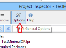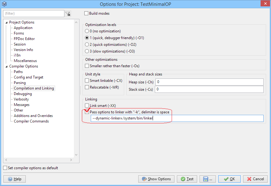 В Лазарусе после того, как назначили все нужные настройки (компилятор, цель и --dynamik-linker) следует скомпилировать проект, нажав Run -> Compile. В окне сообщений компилятора должно появиться "Project "TestMinimalOP" successfully built"