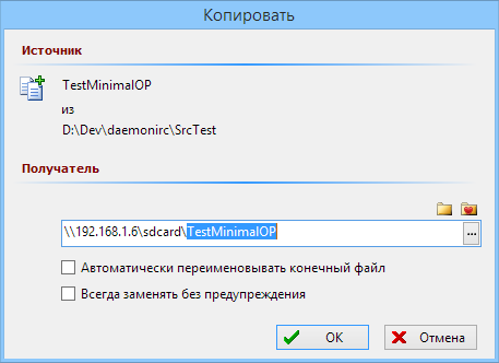 Чтобы скопировать исполняемый файл на телефон, я пользуюсь приложением Samba Filesharing, которое можно установить из Play Маркета. Следует установить это приложение, установить в нём логин и пароль для доступа к сетевому диску, включить Wi-Fi на телефоне и нажать в приложении "Enable". Без root-доступа оно скорее всего работать не будет. После нажатия Enable в приложении появится ip-адрес устройства в локальной Wi-Fi сети. Я рекомендую назначить в домашнем роутере постоянный ip-адрес для Android-устройства, на котором вы хотите устанавливать своё приложение. Я у себя назначил для своего планшета адрес 192.168.1.6. Если домашний роутер настроен таким образом, чтобы выдавать Android-устройству постоянно один и тот же адрес, то именно этот адрес и будет появляться в программе Samba Filesharing каждый раз, когда вы будете её активировать. У меня появляется 192.168.1.6. Чтобы открыть в проводнике сетевой диск, следует ввести \\192.168.1.6