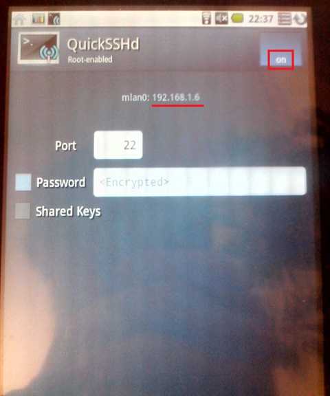 Если всё сработало, то настройка QuickSSHd завершена, и теперь вам остаётся только делать On когда вы хотите, чтобы имелся доступ к Android-устройству по SSH, и делать Off когда доступ не требуется, то есть, например, когда вы взяли телефон с собой и ушли от компьютера куда-нибудь.