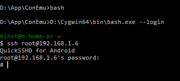 Для того, чтобы с компьютера заходить по SSH на Android, вам потребуется SSH-клиент. Я буду пользоваться SSH-клиентом из Cygwin, а вы можете, например, пользоваться SSH-клиентом Putty. Данные для входа от этого не меняются. Пользователя указываем root, так как QuickSSHd предоставляет доступ именно с этим пользователем, адрес указываем который нужно, пароль указываем тот, который установили. Пользователи Linux могут заходить стандартным клиентом SSH для Linux, который вызывается командой ssh.