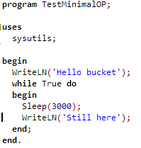 program TestMinimalOP; uses sysutils; begin WriteLN('Hello bucket'); while True do begin Sleep(3000); WriteLN('Still here'); end; end.