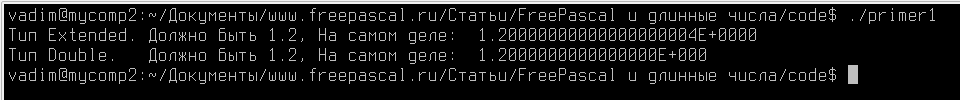 program primer1; Var e: extended; d: double; Begin e:=1.2; d:=1.2; WriteLn('Тип Extended. Должно быть: 1.2; На самом деле: ', e); WriteLn('Тип Double. Должно быть: 1.2; На самом деле: ', d); End.