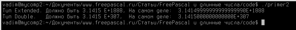 program primer2; Var e: extended; d: double; Begin e:=3.1415e1888; WriteLn('Тип Extended. Должно быть 3.1415 E+1888, На самом деле: ', e); d:=3.1415e307; WriteLn('Тип Double. Должно быть 3.1415 E+307, На самом деле: ', d); End.