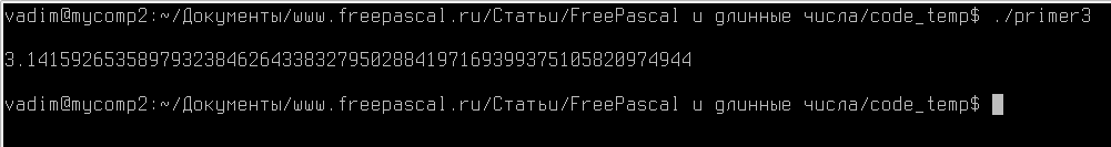 Var f: mpf_t; n1: longword; pc: PChar; s: AnsiString; Begin mpf_set_default_prec(256); mpf_init_set_str(f, '3.141592653589793238462643383279502884197169399375105820974944', 10); n1 := Floor(mpf_get_prec(f) * LOG_10_2); GetMem(pc, n1); mp_sprintf(pc, PChar('%'+IntToStr(n1)+'.Ff'), @f); s := pc; s := Trim(s); WriteLn(s); End;