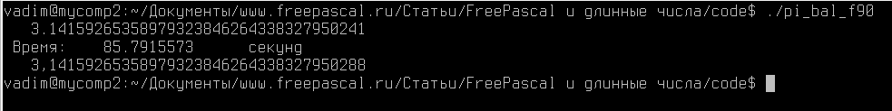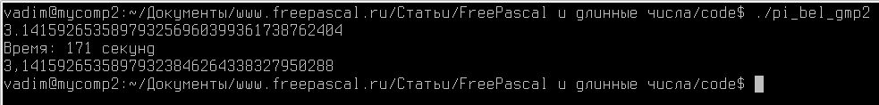 Var pi_bellard: MPFloat; m1, m2, m3, m4, m5, m6, m7, m8: MPFloat; tmp1, tmp2: MPFloat; startt, endt: TDateTime; k: longword; Begin f_set_default_prec(128); pi_bellard := 0.0; tmp1:='-1.0'; tmp2:='2.0'; For k:=0 To 20000000 Do Begin m1 := f_pow_ui(tmp1, k)/f_pow_ui(tmp2, (10*k)); m2 := -(Power(2, 5)/(4*k + 1)); ... end; pi_bellard := pi_bellard * 1.0/Power(2.0, 6.0);