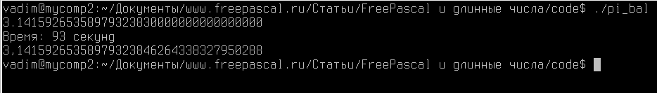 Как видите, функция "mp_sprintf()" работает по тому же принципу, что и "mp_printf()", т.е. используя строку формата формирует из числа требуемую строку, которая потом выводится штатными средствами FreePascal. Поскольку в строковом представлении числа 1 байт это 1 разряд (исходим из предположения, что кодировка у нас ASCI\ANSI или UTF-8), то количество байтов для выделения памяти под строку определяем по известной нам формуле.