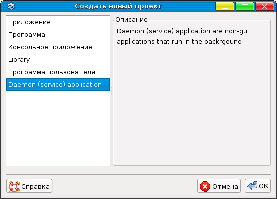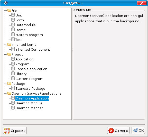 Для этого необходимо установить в Lazarus дополнительные компоненты для создания сервисов. То есть необходимо открыть пакет lazdaemon.lpk и установить его. Он находится в каталоге стандартных компонентов — $lazarus/components/daemon ($lazarus — это та папка, куда установлен IDE lazarus). После успешной компиляции и перезапуска IDE в меню создания нового проекта (меню «Проект/Создать новый проект») будет доступен новый тип проекта (Daemon (service) Application: