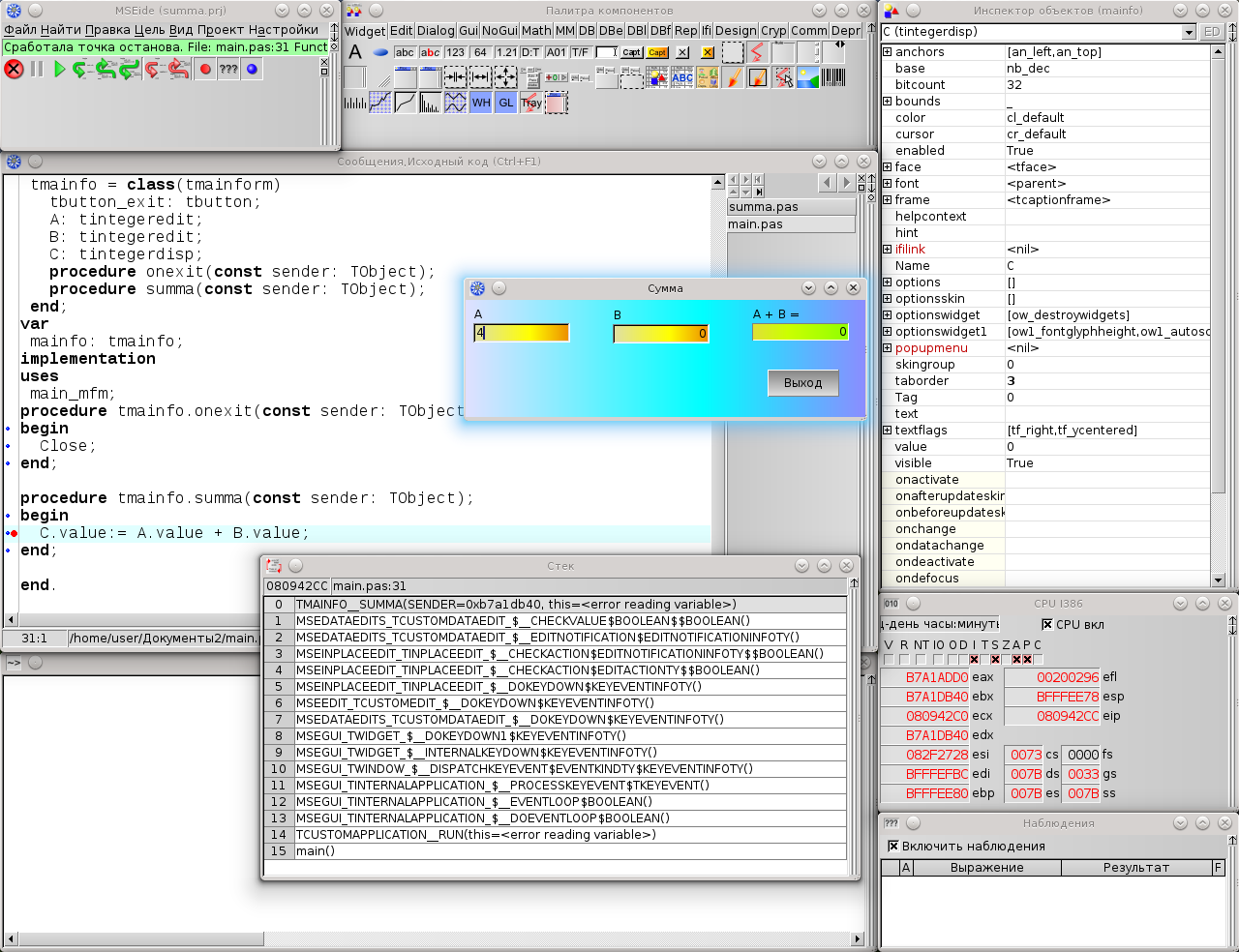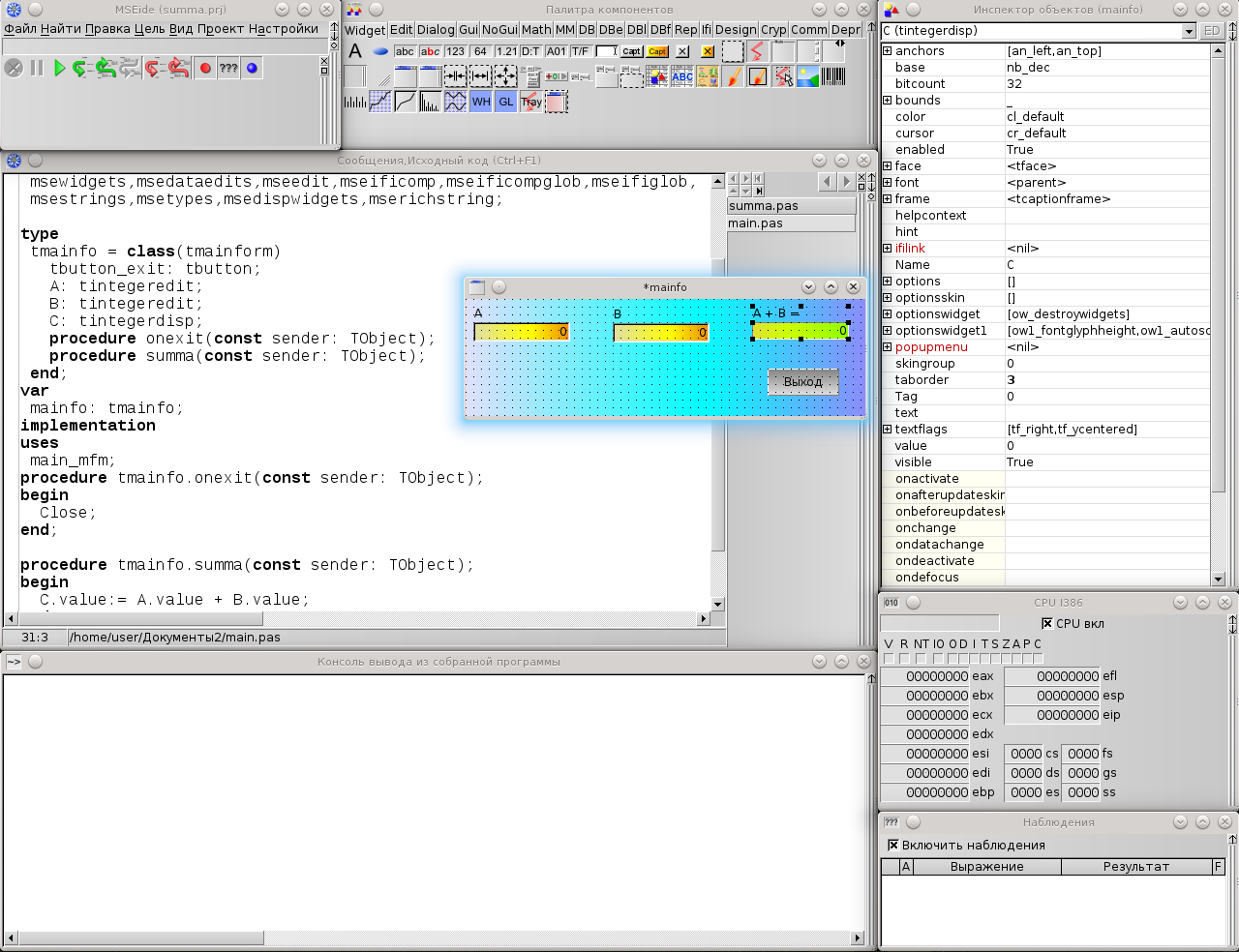 Среда разработки MSEide состоит из четырёх основных окон - главное окно, палитра компонентов, редактор и инспектор объектов. Чтобы получить более полное представление о том, как выглядит MSEide, вы можете рассмотреть приведённые ниже снимки экрана: