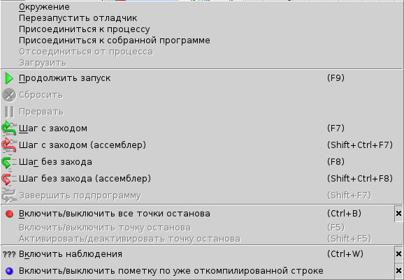 Окружение(Environment) - вызывает диалоговое окно задания параметров командной строки и рабочего каталога запускаемой программы (проекта). Перезапустить отладчик(Restart Debugger) - перезапускает отладчик. Сбросить(Reset) - останавливает работу программы. Пункт, как и соответвующая кнопка на панели Отладчик(Debugger), становиться активным после запуска программы(проекта). Прервать(Interrupt) - прерывает (приостанавливает) работу программы. Шаг с заходом(Step)(F7), Шаг с заходом (ассемблер)(Step Instruction)(Shift+Ctrl+F7) - пошаговое выполнение программы. В первом случае используется код на Pascal, во втором - на Assembler. Шаг без захода(Next)(F8), Шаг без захода (ассемблер)(Next Instruction)(Shift+Ctrl+F8) - пошаговое выполнение программы без захода в подпрограммы. В первом случае используется код на Pascal, во втором - на Assembler. Завершить подпрограмму(Finish)(Shift+F7) - завершает текущую подпрограмму. Включить/выключить все точки останова(Breakpoints on)(Ctrl+B) - включает/выключает точки прерывания. Если режим включен, то программа будет останавливаться в установленных точках прерывания, а если выключен, то точки прерывания будут игнорироваться. Обратите внимание - пункт имеет свой аналог на панели инструментов Отладчик(Debugger). Включить/выключить точку останова(Toggle Breakpoint)(F5) - устанавливает/удаляет точку прерывания. Активировать/деактивировать точку останова(Toggle Bkpt. enabled)(Shift+F5) - активирует/деактивирует точку прерывания. Если точка не была установлена, то будет установлена новая. Включить наблюдения(Watches on)(Ctrl+W) - включает/выключает режим просмотра значений. Включить/выключить пометку по уже откомпилированной строке(Exec Line Hint on) - включает/выключает пометки. При включенном режиме в редакторе слева от строчек, для которых был создан код в исполняемом файле, появятся синие метки.