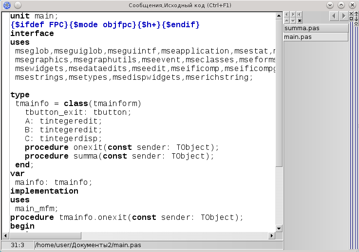 Окно редактора предназначено для редактирования исходного текста программы (модуля). Редактор позволяет редактировать несколько файлов одновременно. Работа с редактором ничем не отличается от работы с любым другим текстовым редактором (такими как Notepad, Wordpad). Список открытых для редактирования файлов находится в правой части окна. В нижней части окна находится область сообщений, в которой вы будете видеть вывод сообщений компилятора: