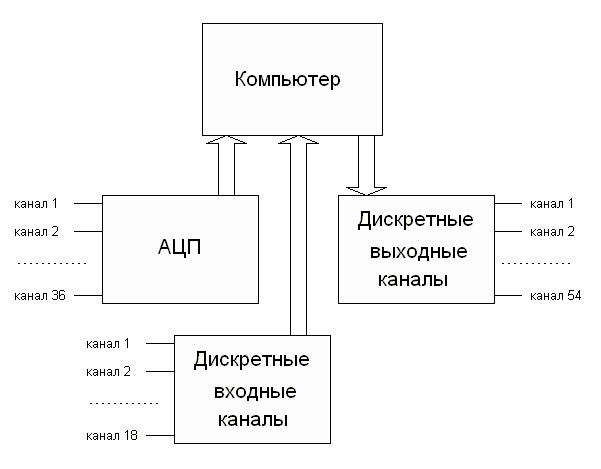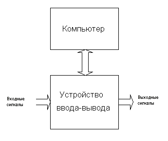 Входные сигналы (аналоговые или дискретные) поступают на входные каналы устройства ввода – вывода. Устройство ввода – вывода преобразует входные сигналы в цифровой код. После этого устройство ввода – вывода пересылает цифровой код, по каналу связи в компьютер. В компьютере происходит обработка поступившей информации, специальной программой. В программе могут быть реализованы различные алгоритмы обработки информации. После обработки данных программой, цифровой код засылается в выходные каналы устройства ввода – вывода.