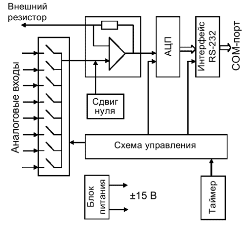 В качестве устройства ввода в компьютер аналоговых сигналов применяется преобразователь аналоговых сигналов в цифровой код (АЦП). Модуль АЦП преобразования, производимый российской фирмы "Reallab"(www.rlda.ru, город Таганрог):