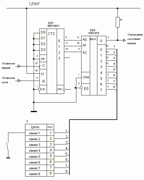 Логика работы схемы изображенной на рисунке 6, следующая: подается импульс "установка нуля", подачей логической единицы на вход R, двоичного счетчика выполненного на микросхеме DD1, все разряды счетчика устанавливаются в нулевое состояние. двоичный код 0000 подается на управляющие входы мультиплексора, выполненного на микросхеме DD2. Мультиплексор подключает канал 0 на выходной канал микросхемы. Компьютер считывает состояние канала, и выдает импульс "установка канала". Двоичный счетчик производит сложение и выставляет на своих выводах код 0001. Мультиплексор подключает к своему выходному каналу, первый входной канал. Компьютер считывает состояние канала и выдает импульс "установка канала". Когда счет доходит до восьмого канала подается импульс "установка нуля" и все повторяется сначала.