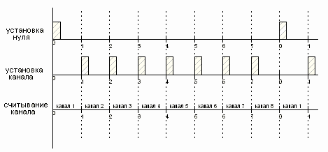 Импульс "установка нуля" играет роль не только установки нуля для счетчика, но также является импульсом синхронизации. Если произойдет сбой при счете импульсов, то каналы будут считываться неправильно только на одном цикле. При подаче импульса "установка нуля" правильность считывания восстановится. Обработку ошибочного считывания можно учитывать в программном обеспечении. Например учитывать большее из трех импульсов.