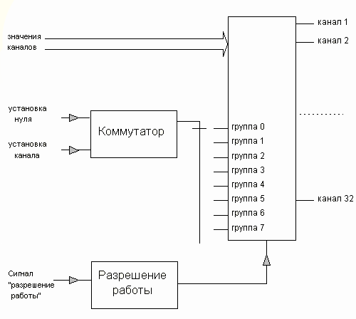 Устройство вывода дискретных сигналов работает по следующему принципу: коммутатор поочередно вырабатывает высокий логический уровень для каждой группы каналов, в которую записываются определенные программой управления значения. Для записи в параллельном порте Centronic доступен байт, находящийся по адресу 378(H).