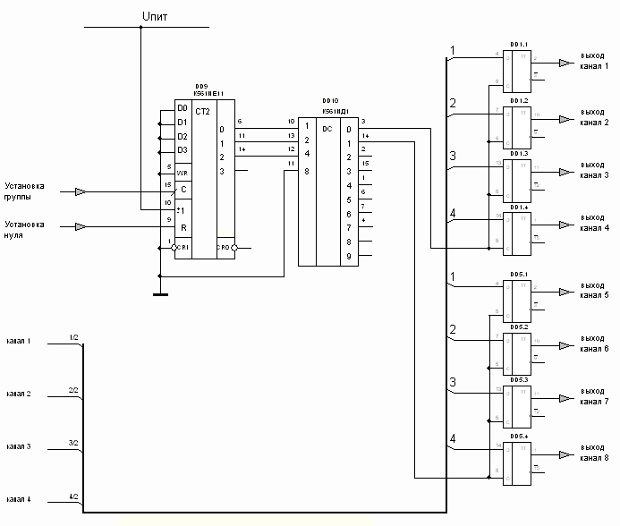 Для управления группами каналов используются те же сигналы, что и в устройстве ввода дискретной информации. Для подачи разрешения на вход С триггера используется двоично-десятичный дешифратор на микросхеме К561ИД1.