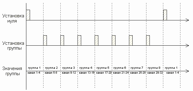 Дойдя до 8 группы подается импульс "установка нуля" и все повторяется сначала.