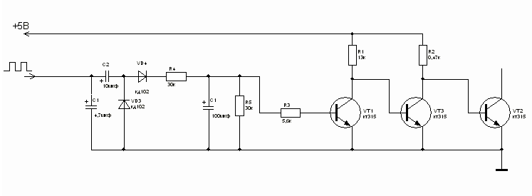Выходной каскад порта LPT имеет внутренне сопротивление 470 ом. Конденсатор С1 (рисунок 6) отфильтровывает высокие частоты (выше 600 Герц). Конденсатор С2 отфильтровывает низкие частоты (менее 10 Герц). Выпрямитель выполненный на диодах VD1 и VD2, через резистор R1 заряжает конденсатор С3, который разряжается через резистор R3 и через переход база – эмиттер транзистора VT1. Ток протекающий через базу транзистора VT1 вызывает его открывание. При открытом транзисторе VT1 закрывается транзистор VT2 и открывается транзистор VT3. Открытый транзистор VT3 разрешает протекание тока через переход база – эмиттер транзисторного ключа (рисунок 14).