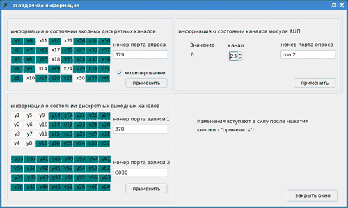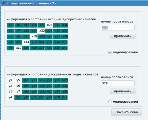 Поток вывода визуальной информации выводит отладочную информацию о состоянии входных – выходных дискретных каналов на отдельную форму. Форма с отладочной информацией по умолчанию для просмотра не доступна. Для большей стабильности работы системы в целом, поток вывода визуальной информации имеет наименьший приоритет.