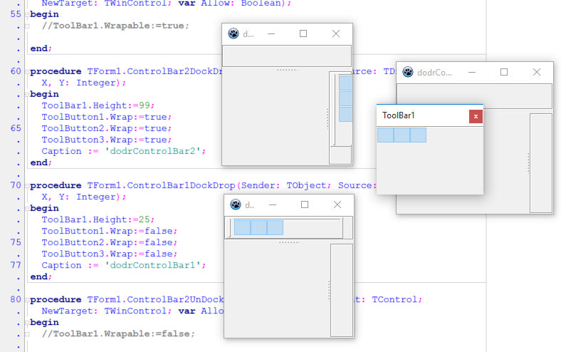 А "таскалку", которая в виде полосочки сбоку, её положение тоже можно менять, если назначать ей: align := Top, либо align := left (или прилепить к Top или Left), в зависимости от крепления панельки и вставить в те же обработчик событий. Я так делал неделю назад, это в инспекторе меняется, соответственно можно и из кода менять. Посмотрите там есть.