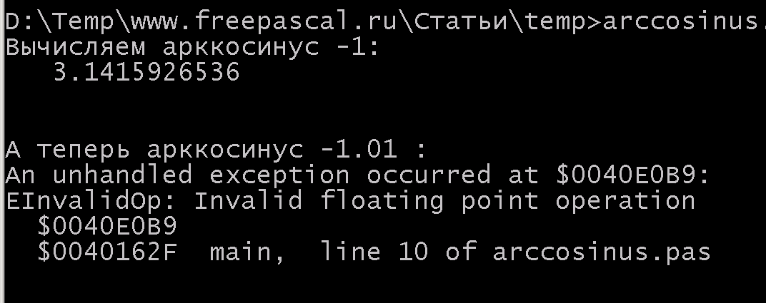 Видите ли, я специально вывесил этот рисунок чтобы показать - в арккосинус можно передавать любые значения только в том случае, если он работает с комплексными числами. А FPC, как Вы успели убедиться, с комплексными числами не работает, такого встроенного типа здесь нет, в отличие от Фортрана. Поэтому то, что Вы получаете - это не баг, а именно то, что должно быть. Если не верите Снег Северу, который сказал Вам чистую правду, то загляните хотя бы в Википедию...