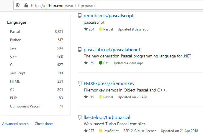 Стал знакомиться с Github и в упор не вижу не только Delphi и Lazarus, но даже просто Pascal. Вообще нет в списках языков. Что за дискриминация? Или я не там смотрю?