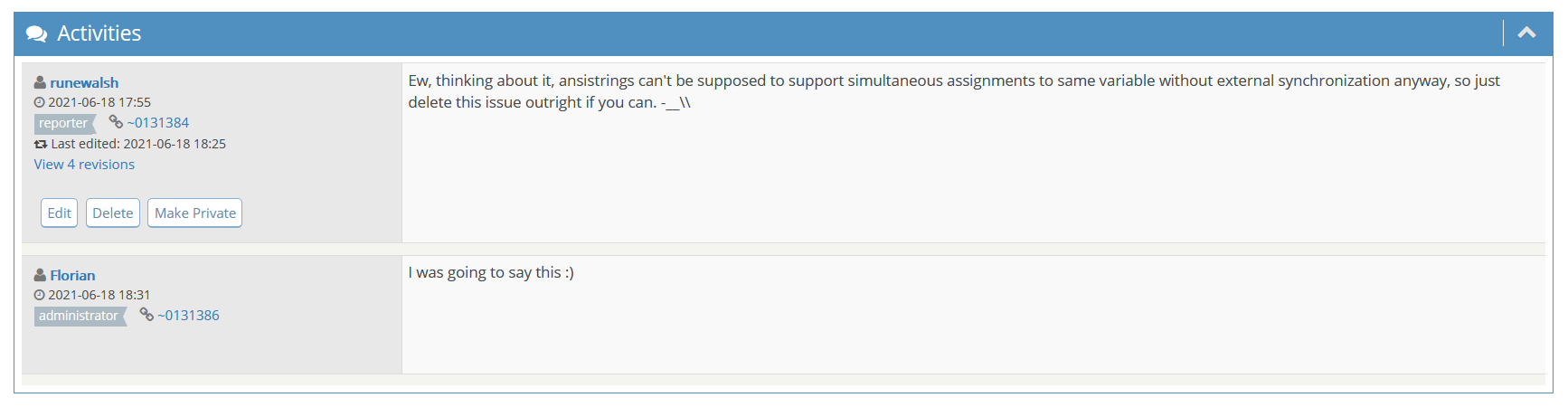 А как читать в локальную переменную -- обычным оператором присваивания строк, который не атомарный, или как-то по-особому? В вашем коде который про "забить" и в коде топикстартера я отчётливо вижу A:=B и B:=C в двух параллельных потоках.
